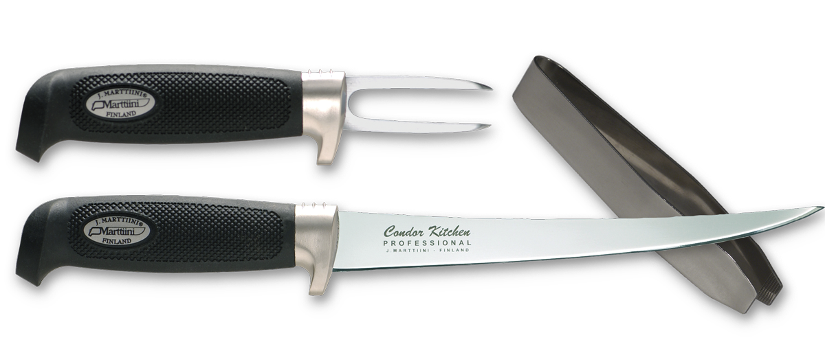Cutia din lemn ce gazduieste setul contine cutitul Marttiini de filetat, faimos la nivel mondial pentru calitatea sa, o furculita pentru a va facilita munca si o penseta pentru indepartarea oaselor.