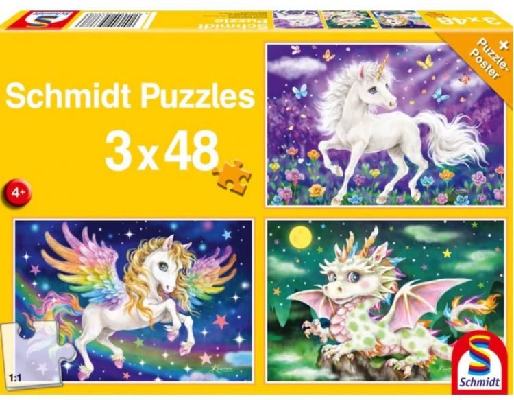 Puzzle Schmidt: Animale mitice - Setul include 3 puzzle-uri cu ilustratii diferite a cate 48 piese fiecare + 1 poster Cadou. Creaturile fictive din legende si fabule se vor regasi in acest puzzle minunat si dragut.