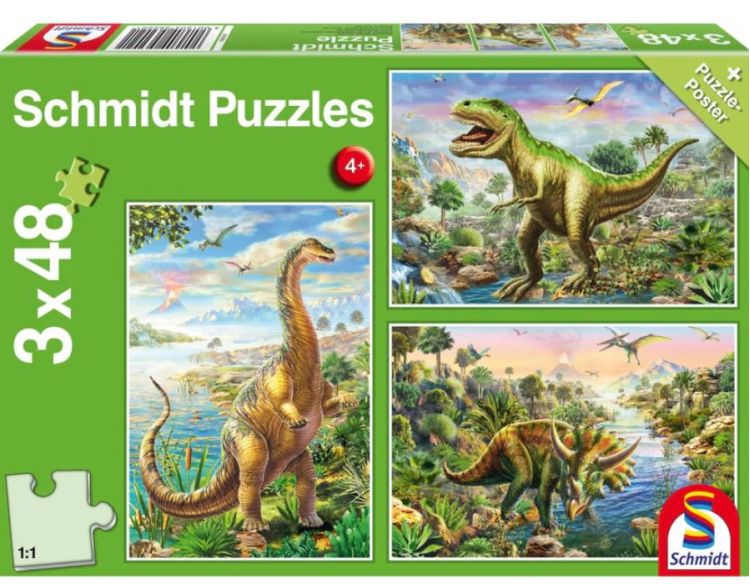 Puzzle Schmidt: Aventurile dinozaurilor - Setul include 3 puzzle-uri cu ilustratii diferite a cate 48 piese fiecare + 1 poster Cadou. Dinozaurii sunt un grup divers de reptile ele au aparut pentru prima data in perioada Triasica. Te invit sa le descoperi!