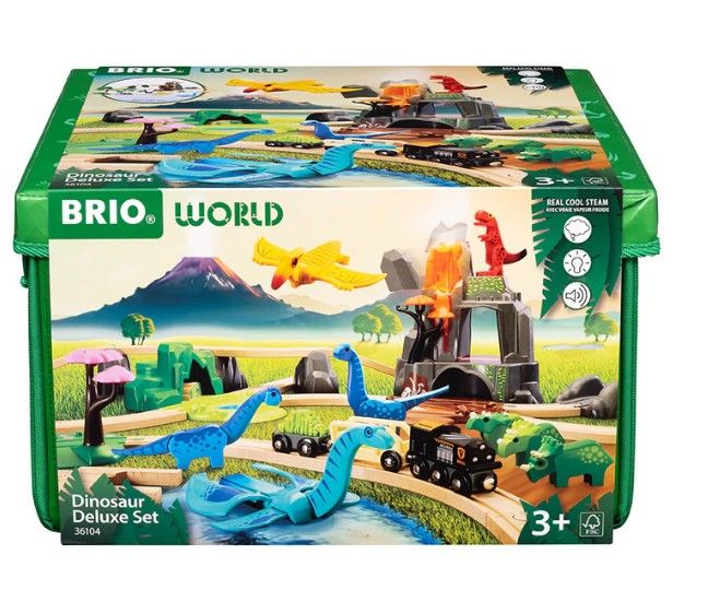 Explorati lumea preistorica a dinozaurilor cu acest set deluxe format din 44 de piese – complet cu figurine de dinozauri, multa joaca cu trenulete si un vulcan care erupe cu lumini, sunete si efecte de aburi.