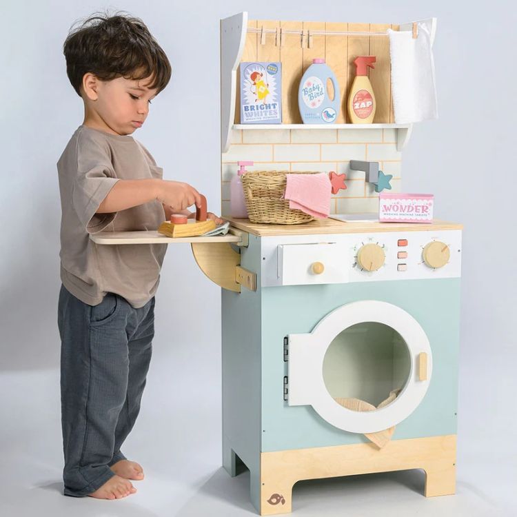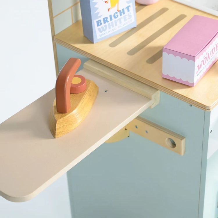 Spalatoria Tender Leaf - Tender Leaf Laundrette - din lemn premium, este o unitate completa de spalatorie unde poti spala, usca, calca si impaturi toate hainele papusilor tale! Foloseste cosul impletit pentru a aduna rufele murdare, pune-le in masina de spalat si adauga 2 tablete in sertarul de sus. Apasa butoanele pentru a porni/opri si selecteaza un program si o viteza de centrifugare folosind cele 2 butoane care fac clic. Selecteaza temperatura pentru ciclul de uscare si priveste cum hainele sunt invartite! Include o chiuveta pentru spalare manuala si 3 produse de curatare din lemn si 2 din carton pentru o zi de spalare reusita! Atarna hainele pe una dintre cele 3 sfori folosind carlige de lemn, apoi calca-le bine pe masa de calcat pliabila din lateral. Ideal pentru jocuri de rol si pentru dezvoltarea abilitatilor sociale si de comunicare.