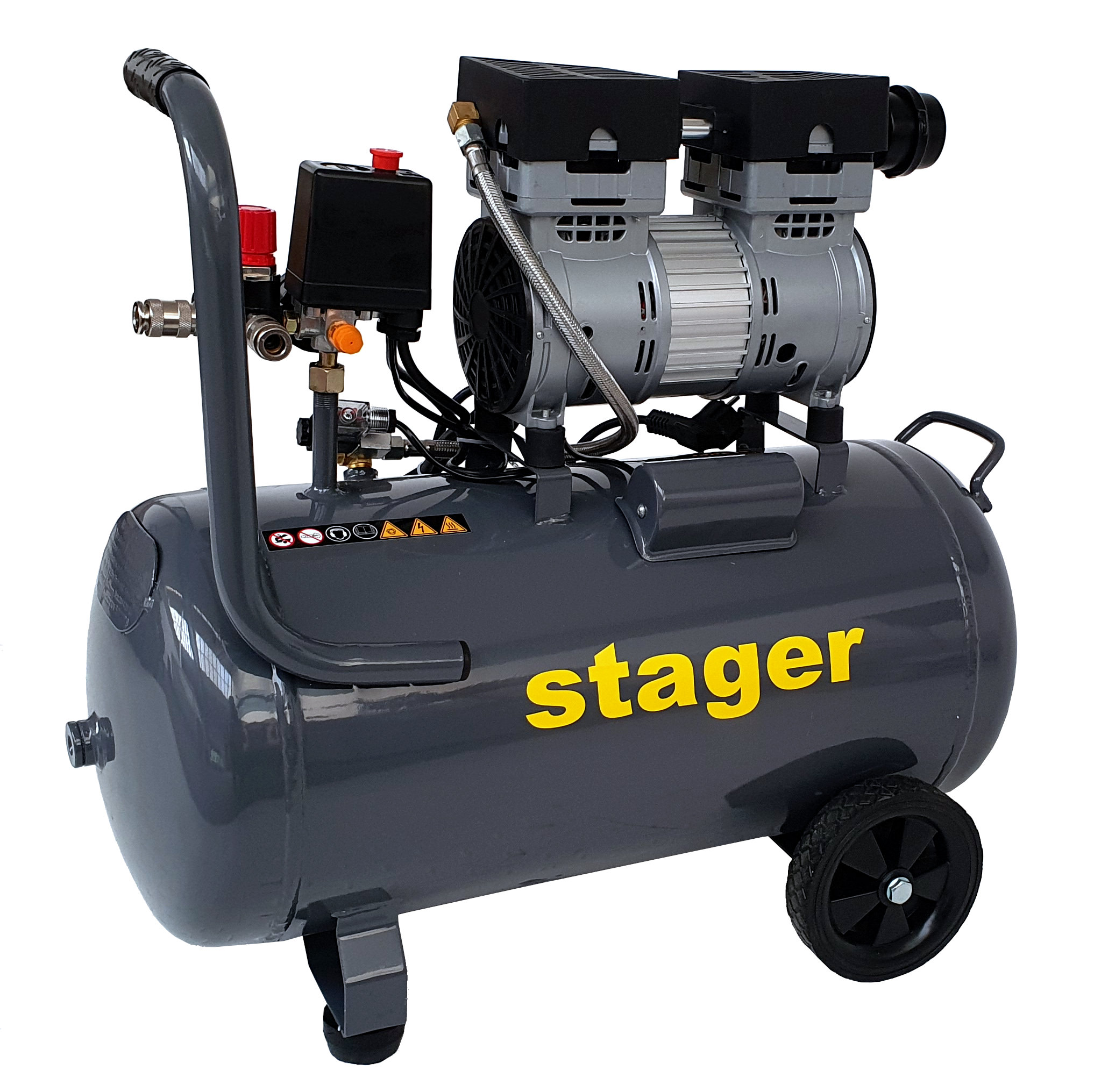 Toate compresoarele Stager prezinta in dotarea de serie presostat, regulator de presiune cu cupla rapida (doar modelele monofazate), manometru presiune butelie si manometru presiune reglata, supapa de siguranta, robinet de purjare, roti, maner pentru transport si suport anti-vibratii.