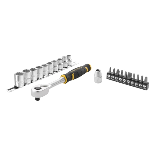 22 de piese 3/8: 1 clichet cu 120 de din?i, 10 chei tubulare poligonale (8-9-10-11-12-13-14-15-16-17 mm), 1 adaptor 3/8" biti 1/4", 10 biti 1/4 (Ph.0-1-2, lat 3,5-4,5-8 - TT15-TT20-TT25-TT30)