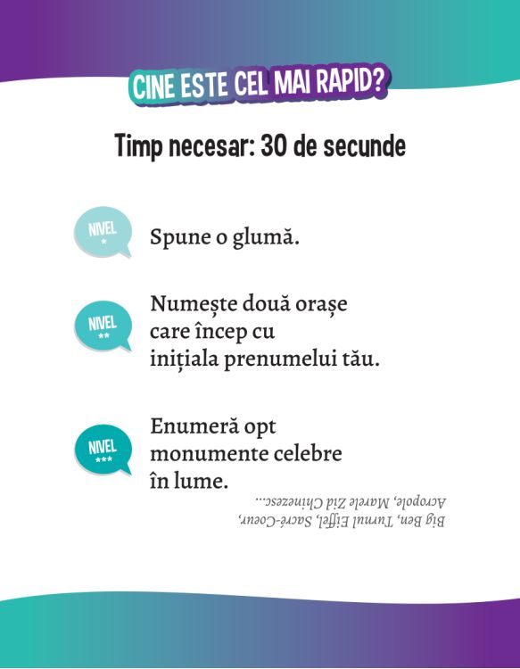 Recomandat de la 7 la 107 ani, jocul devine un liant intre generatii, incurajand interactiunea si transformand fiecare runda intr-o experienta vesela si educativa. Fiecare carte de joc ascunde o noua surpriza, iar ritmul alert mentine entuziasmul ridicat pana la final.