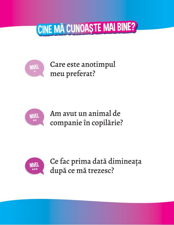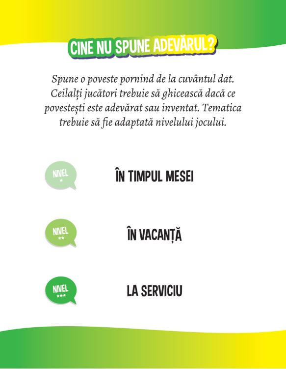 Intrebarile si misiunile variaza de la curiozitati culturale si provocari fizice, pana la jocuri de mima si ghicitori haioase. Diversitatea lor stimuleaza memoria, gandirea rapida si creativitatea, in timp ce intaresc legaturile dintre membrii familiei prin colaborare si spirit competitiv. Regulile sunt simple: jucatorii trebuie sa raspunda corect la intrebari sau sa indeplineasca provocarile, iar cel care acumuleaza cele mai multe puncte la final este declarat castigator.