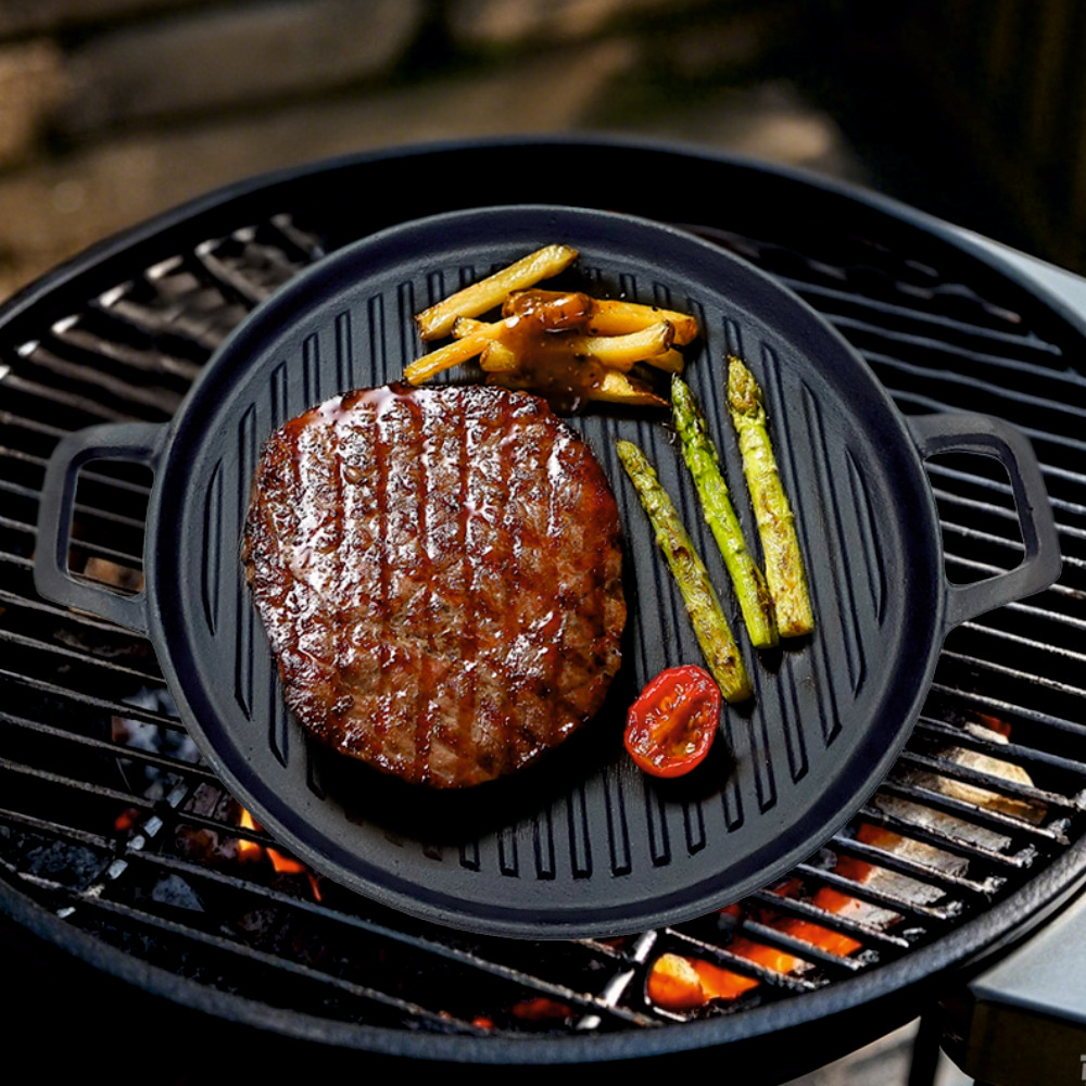 Gătire uniformă, fără lipire, direct pe jar sau grătar. Pregătește preparate delicioase cu aspect de grătar și gătire uniformă cu tava gril, ideală pentru utilizare direct pe grătare, plite sau chiar pe jar. Construită pentru rezistență și distribuție eficientă a căldurii, această tavă este perfectă pentru carne, pește, legume, brânzeturi la grătar sau burgeri vegetali. Designul striat al suprafeței lasă urme specifice de grătar pe alimente și permite scurgerea excesului de grăsime, pentru un preparat mai sănătos și gustos. Materialul gros menține temperatura constantă și distribuie uniform căldura, prevenind arderea alimentelor și lipirea acestora. Poate fi utilizată direct pe grătare cu cărbuni, plite cu gaz sau inducție, iar în unele cazuri chiar și în cuptoare.