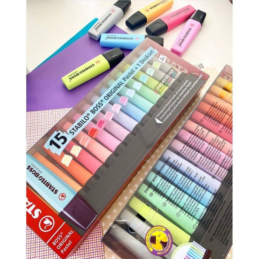 Textmarker Stabilo Boss Original, 15 culori/set, 9 culori fluorescente, 6 culori pastelate, cu suport de birou