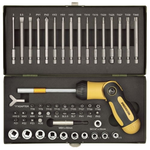 Contine 23 de biti cu prindere hexagon de 1/4" (6.3mm) cu o lungime standard de 25mm si 16 biti cu o lungime de 80mm pentru suruburile ingropate. Un adaptor tata patrat 1/4" - tata HEX 1/4" si mama patrat 1/4" - mama HEX 1/4" sunt incluse in pachet.