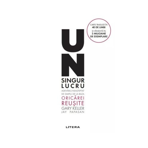 Cine alearga dupa doi iepuri nu prinde nici unul Asaltul zilnic de e-mailuri mesaje si intalniri ne distrage de la ce e important si ne streseaza enorm. Solicitarile de la locul de munca si din familie sunt din ce in ce mai numeroase. Rezultatul productivitate scazuta deadline-uri depasite castiguri mai mici incetarea ascensiunii profesionale. DAR VREM MAI MULT. Vrem mai multa productivitate. Vrem castiguri mai mari pentru un nivel de viata mai ridicat vrem mai mult timp pentru noi familia si prietenii nostri. Dar putem sa facem mai putine lucruri si sa realizam mai mult. Teoria unui SINGUR lucru ne obliga sa gandim la scara mare sa analizam lucrurile atent pentru a crea o lista sa ne stabilim prioritatile si sa ne concentram asupra primului lucru de pe lista acel un SINGUR lucru care declanseaza efectul de domino. Prin urmare sa ne pregatim sa traim o viata noua A atins o coarda sensibila ... faptul ca atunci cand te trezesti dimineata te concentrezi asupra acelui lucru pe care vrei sa-l realizezi in timpul zilei ceea ce pare simplu. MARIA SHARAPOVA fost numar unu din tenisul mondial Un singur lucru de Gary Keller si Jay Papasan este o carte usor de citit dar profunda care m-a ajutat sa ma concentrez pe mentinerea in atentie a lucrului principal in toate domeniile vietii mele. BRANDON TURNER autor si coprezentator al The BetterLife Podcast UN SINGUR LUCRU te invata sa obtii rezultate mai bune in mai putin timp sa reduci stresul sa scapi de sentimentul de coplesire sa iti recapeti energia sa obtii rezultate extraordinare la munca si in viata personala. Intreprinzatorul anului titlu acordat de Ernst amp Young in 2003 si finalist in cursa pentru titlul de Intreprinzator al anului acordat de revista Inc. GARY KELLER este recunoscut ca unul dintre cei mai influenti lideri din industria imobiliara americana. Mai multe dintre cartile sale au fost bestsellere printre care The Millionaire Real Estate Agent 2004 The Millionaire Real Estate Investor 2005 si SHIFT How Top Real Estate Agents Tackle Tough Times 2008 si au ocupat pozitii pe listele New York Times si Wall Street Journal. Colectiv titlurile sale s-au vandut in peste 5 4 milioane de exemplare in intreaga lume. Inainte ca JAY PAPASAN sa semneze impreuna cu Gary Keller seria de bestsellere Millionaire Real Estate a fost editor la Harper Collins Publishers. Acolo a lucrat la carti de succes precum Body-for-Life de Bill Phillips si Go for the Goal de Mia Hamm. Jay este orator si coproprietar al unei echipe imobiliare de succes afiliata la Keller Williams Realty impreuna cu sotia sa Wendy in Austin TX.