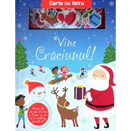 Vine Craciunul! este o carte cartonata cu pagini din fetru, placute la atingere, si piese din fetru, care se agata cu usurinta de paginile cartii si pot fi folosite de nenumarate ori. Copiii vor fi bucurosi sa completeze fiecare imagine magica, potrivind figurinele in asa fel incat sa ilustreze micile povesti. Contine 22 de piese din fetru si 5 scene pe care sa le completezi jucandu-te. Recomandat copiilor de la 3+ ani.