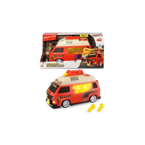 Dickie Toys este renumit pentru ideile sale de joc iar masina VW T3 cu un aspect retro nu face exceptie. Prin apasarea butonului de pe acoperis poate fi lansat un proiectil pe care camperii cu aspect post-apocaliptic o pot folosi pentru a merge la vanatoare. Include trei proiectile care pot fi depozitate in suportul special de pe masinuta Cu efecte luminoase si sonore. Fabricat sub licenta Volkswagen.