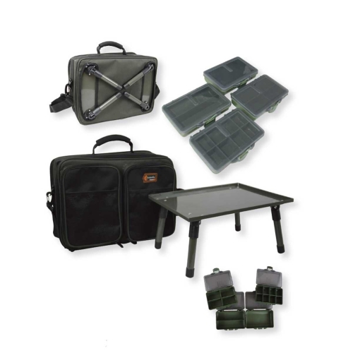 Masa de lucru Prologic Cruzade Rig Station cu picioare rabatabile, destinata realizarii monturilor de crap direct pe malul apei. De jur imprejur, masuta dispune de un cadru de protectie, ce impiedica pierderea accesoriilor si monturilor depozitate pe masa. Masa este livrata alaturi de o geanta pentru transport prevazuta cu fermoar rezistent de 10mm latime si buzunare din plasa la interior. In acest kit se mai regasesc 4 cutii pentru accesorii, foarte utile pentru depozitarea agrafelor, carligelor si altor accesorii marunte, dispun de un sistem de inchidere precis si o forma perfect ergonomica. Masa este prevazut cu mane captusit si curea de umar pentru un transport facil.